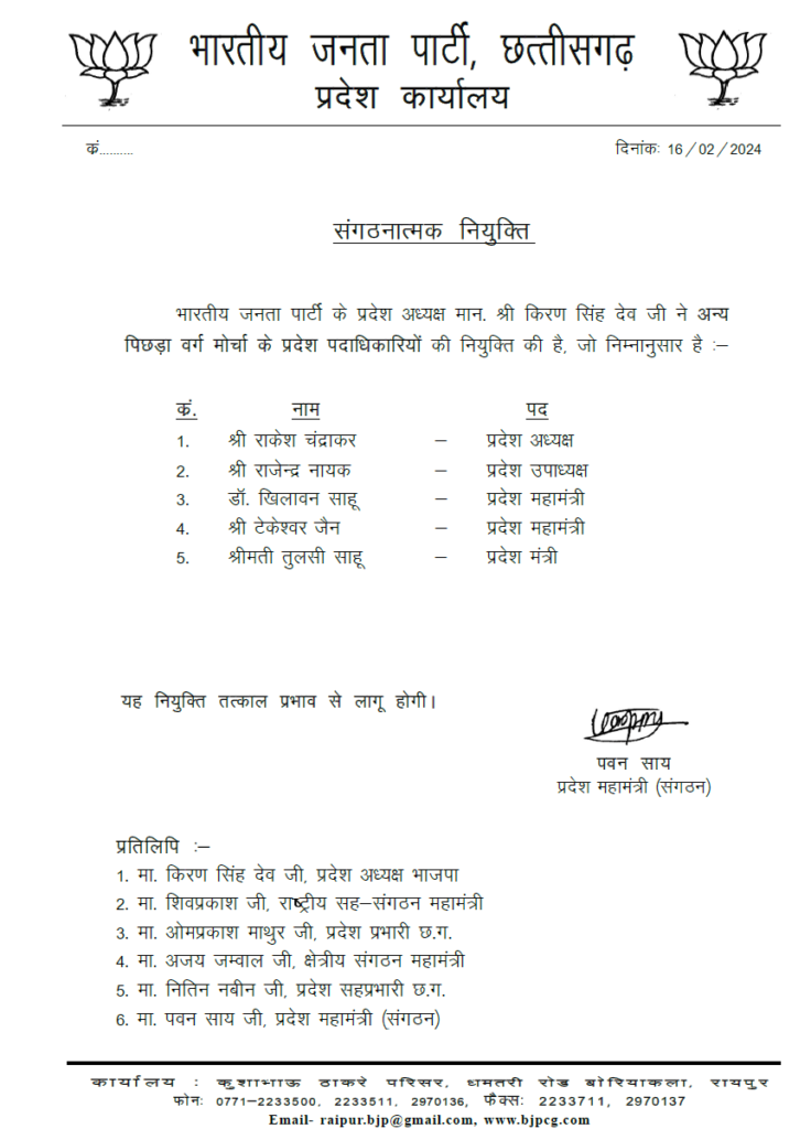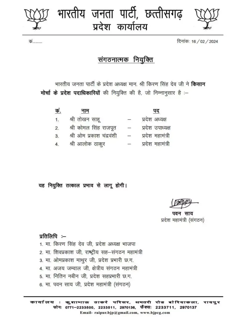 रायपुर । भाजपा के मोर्चा-प्रकोष्ठों में पदाधिकारियों की नियुक्तियां शुरू हो गई हैं। शुक्रवार को किसान मोर्चा और अन्य पिछड़ा वर्ग के पदाधिकारियों के नाम जारी किए गए हैं।