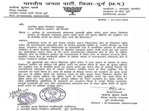 उन्होंने बीते 26 मार्च को मंगलवार को पाटन विधानसभा के आमालोरी गांव में आयोजित कांग्रेस के कार्यकर्ता सम्मेलन में भड़काऊ भाषण दिया। भूपेश बघेल ने भारत निर्वाचन आयोग के खिलाफ बयान जारी कर EVM की विश्वसनीयता पर सवाल उठाया। शिकायत में लिखा है- भूपेश बघेल ने सार्वजनिक मंच से बयान दिया है कि अगर राजनांदगांव लोकसभा क्षेत्र में 384 से ज्यादा कैंडिडेट होंगे तो निर्वाचन आयोग को राजनांदगांव में बैलेट पेपर से मतदान करवाना होगा। इसलिए पाटन क्षेत्र के कार्यकर्ता ज्यादा से ज्यादा राजनांदगांव लोकसभा क्षेत्र में नामांकन दाखिल करें