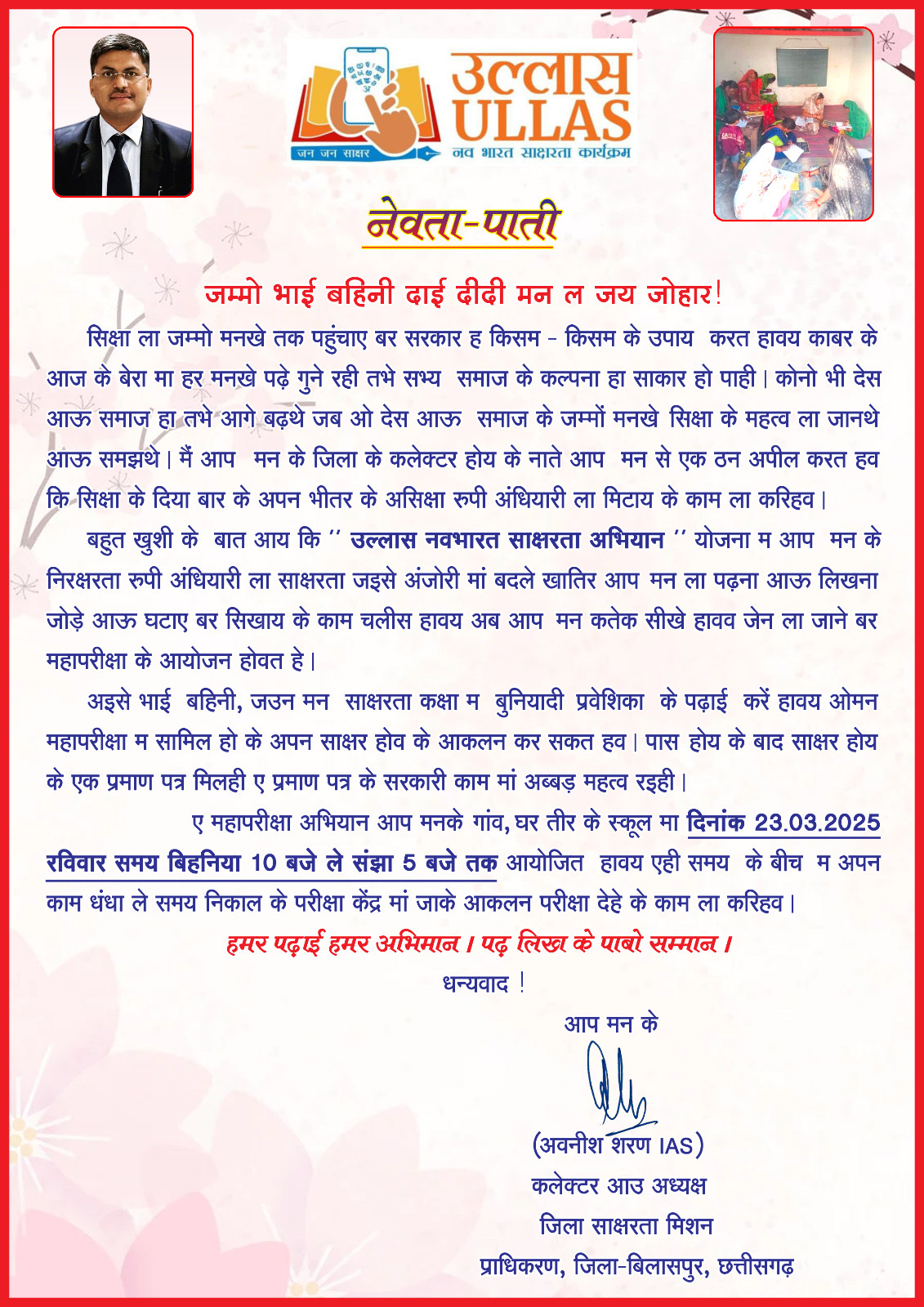 कलेक्टर ने छत्तीसगढ़ी बोली में नेवता पाती भेजकर असाक्षरों को किया आमंत्रित