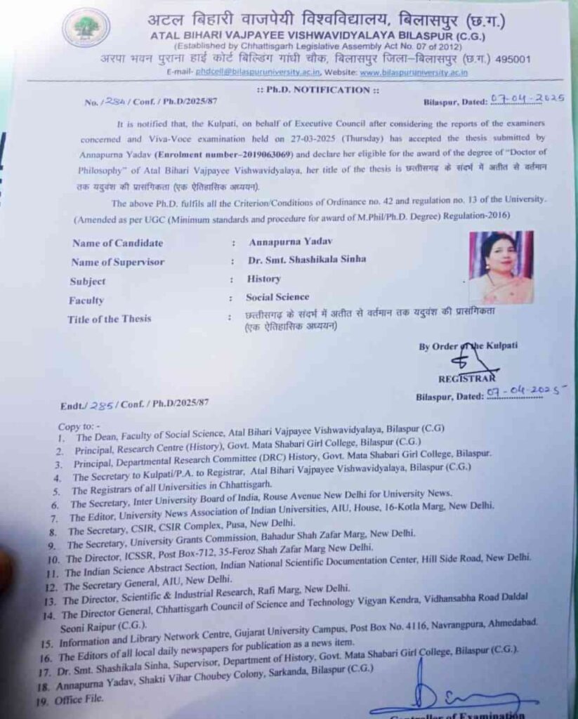 बिलासपुर।अटल बिहारी विश्व विद्यालय से श्रीमती अन्नपूर्णा यादव को पी.एच.डी. की उपाधि प्रदान की गई। उनके शोध का विषय “छत्तीसगढ के संदर्भ में प्राचीन से वर्तमान तक यदुवंश की प्रासंगिकता” (एक ऐतिहासिक अध्ययन) है। इन्होंने अपना शोध कार्य डा श्रीमती शशि कला सिन्हा, जो शा.माता शबरी नवीन कन्या महाविद्यालय में इतिहास विभाग की विभागाध्यक्ष है।