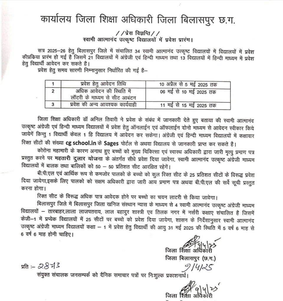 बिलासपुर । सत्र 2025-26 हेतु बिलासपुर जिले में संचालित 34 स्वामी आत्मानंद उत्कृष्ट विद्यालयों में विद्यालयों में प्रवेश कीप्रकिया प्रारंभ हो गई है जिसमें 21 विद्यालयों में अंग्रेजी एवं हिन्दी माध्यम तथा 13 विद्यालयों में हिन्दी माध्यम में प्रवेश हेतु विद्यार्थी आवेदन कर सकते है।