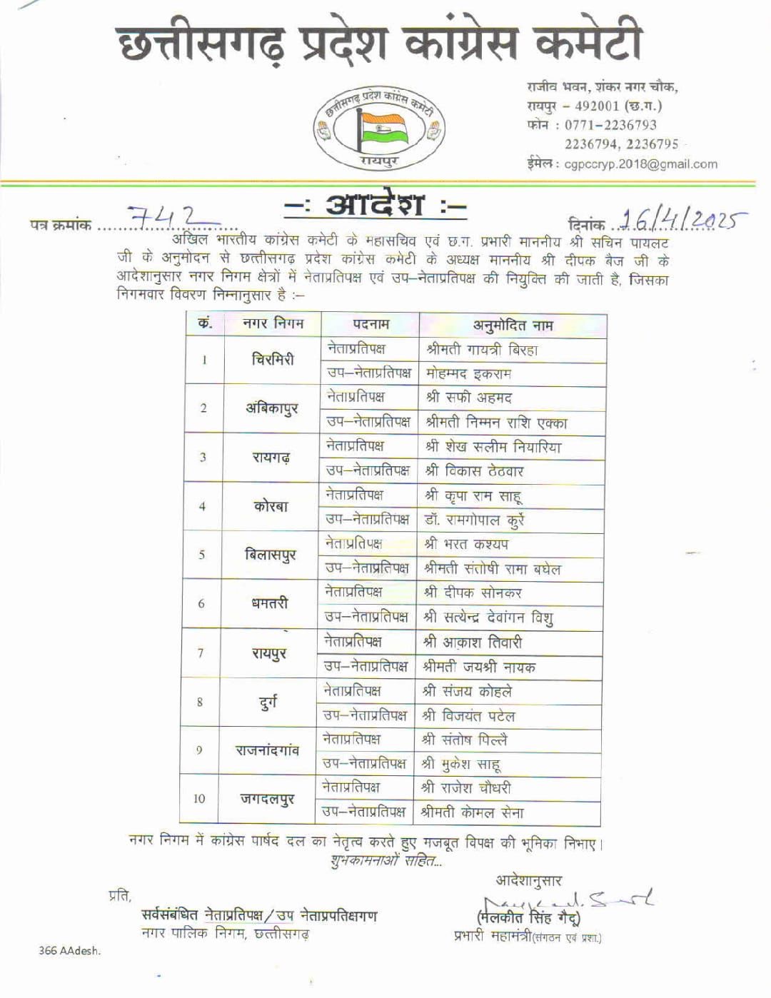उप नेता प्रतिपक्ष पार्षद संतोषी रामा बघेल को बनाया गया है। विस्तृत जानकारी हेतु प्रदेश के नगर निगमों में नियुक्त किए गए नेता प्रतिपक्ष और उप नेता के नामों की पूरी सूची संलग्न देखें ।