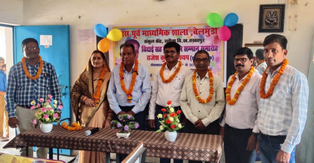 बिलासपुर।शासकीय पूर्व माध्यमिक शाला बेलमुंडी , के प्रधान पाठक राजेश कुमार कश्यप जी के सम्मान में, विदाई सह सेवाकाल सम्मान समारोह का आयोजन, शाला में समस्त स्टाफ एवम बच्चों के द्वारा किया गया। बहुमुखी प्रतिभा के धनी श्री कश्यप जी 41 वर्षो से भी ज्यादा समय तक शिक्षा विभाग में अपनी सेवाएं दी। इस दौरान प्राथमिक, माध्यमिक एवम हायर सेकेंडरी स्कूलों में अध्यापन कार्य किया।