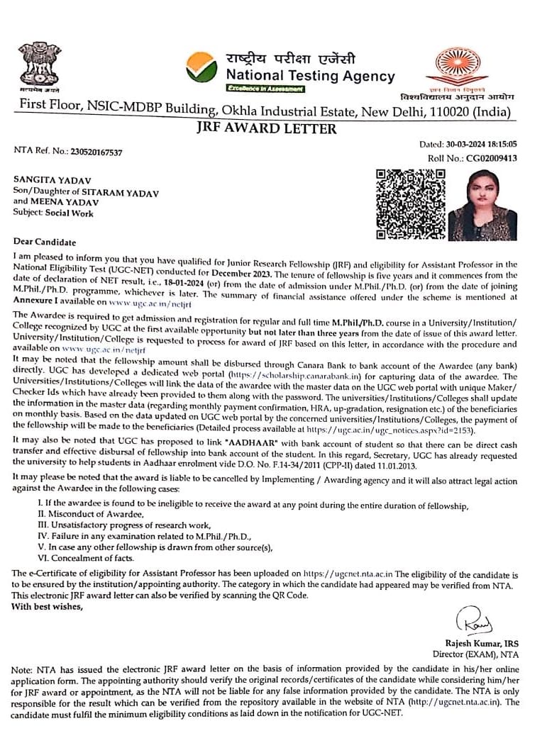 यहाँ उल्लेखनीय है कि सहायक प्राध्यापक पद हेतु नेट के साथ जेआरएफ (जूनियर रिसर्च फेलो) की परीक्षा उत्तीर्ण सबसे विशिष्ट योग्यता होती है, और नेक के साथ जेआरएफ उत्तीर्ण करना बड़ी बात होती है, जेआरएफ प्रमाण पत्र पूरे देशभर में नेट के परीक्षा दिए कुल परीक्षार्थी में से मात्र 2% लोगों को ही मिल पाती है।