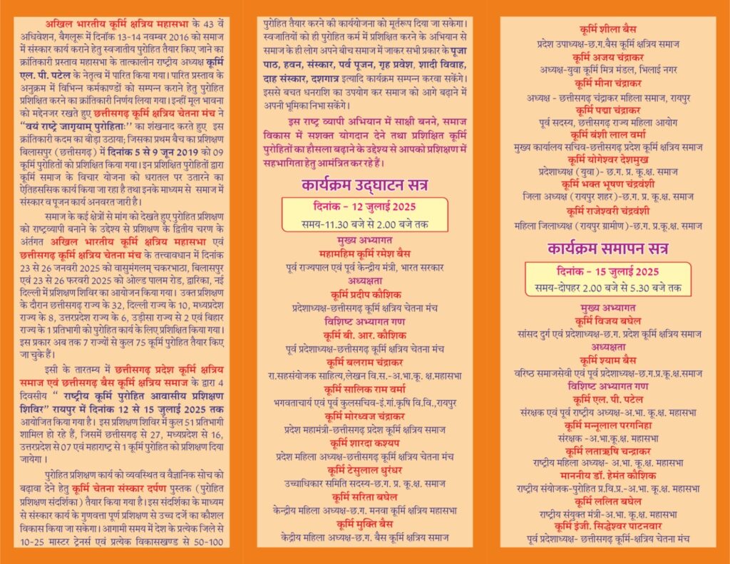 राष्ट्रीय कूर्मि पुरोहित आवासीय प्रशिक्षण शिविर का आयोजन 12 जुलाई से:शुभारंभ में रमेश बैस पूर्व राज्यपाल सहित छत्तीसगढ़ एवं राष्ट्रीय पदाधिकारी होंगे शामिल