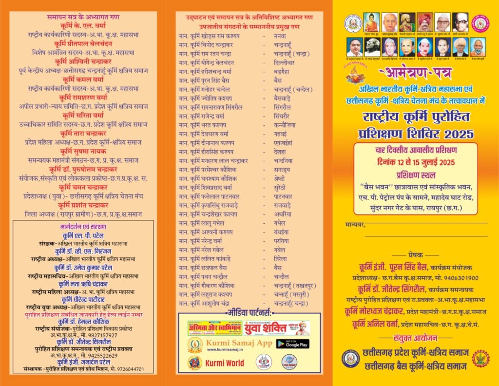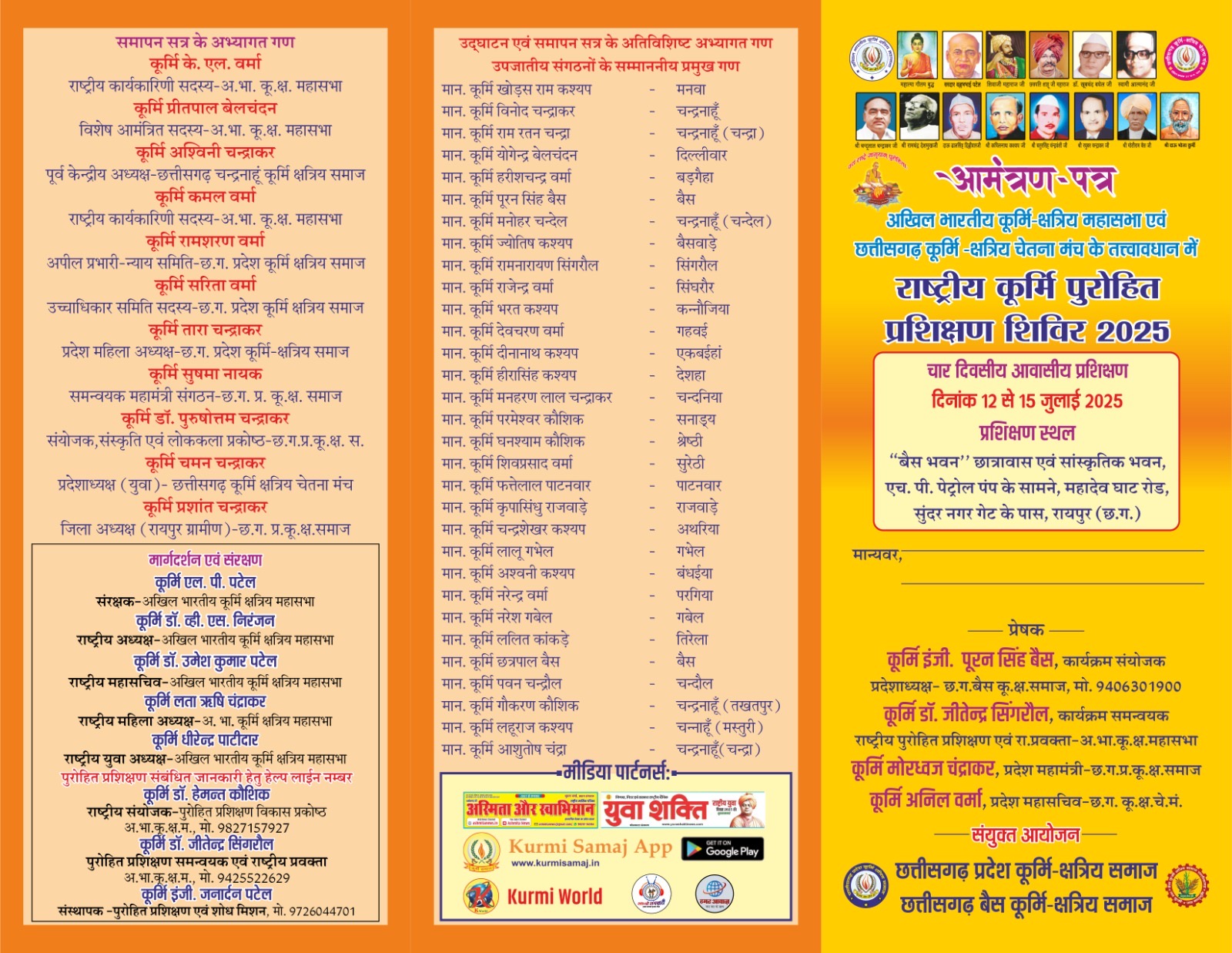 रायपुर।अखिल भारतीय कूर्मि-क्षत्रिय महासभा एवं छत्तीसगढ़ कूर्मि-क्षत्रिय चेतना मंच के संयुक्त तत्वाधान तथा छत्तीसगढ़ प्रदेश कूर्मि-क्षत्रिय समाज व छत्तीसगढ़ बैस कूर्मि-क्षत्रिय समाज के संयोजन में दिनांक 12 से 15 जुलाई 2025 तक 4 दिवसीय आवासीय राष्ट्रीय कूर्मि पुरोहित आवासीय प्रशिक्षण शिविर का आयोजन ’’बैस भवन’’ छात्रावास एवं सांस्कृतिक भवन, बैस कूर्मि क्षत्रिय समाज, एच. पी. पेट्रोल पंप के सामने, महादेव घाट रोड, सुंदर नगर गेट के पास, रायपुर (छत्तीसगढ़) में किया जा रहा है। इस राष्ट्र व्यापी अभियान में साक्षी बनने, समाज विकास में सशक्त योगदान देने तथा प्रशिक्षित कूर्मि पुरोहितों का हौसला बढ़ाने के उद्देश्य से आपको प्रशिक्षण में सहभागिता हेतु आमंत्रित कर रहे हैं।