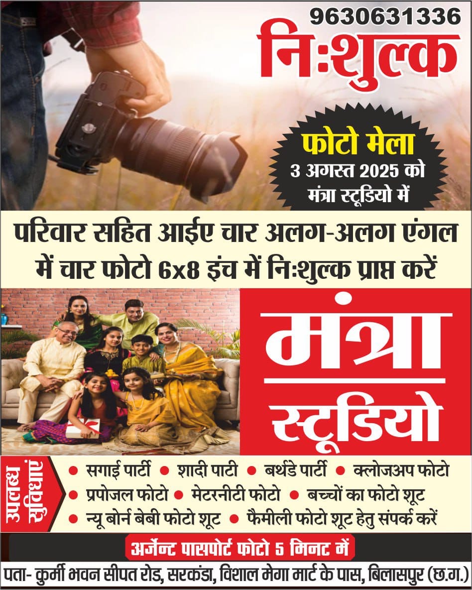 बिलासपुर। मंत्रा स्टूडियो में 3 अगस्त 2025 को विशेष फोटो मेला का आयोजन किया जा रहा है। मंत्रा स्टूडियो के संचालक अशोक राय ने बताया की फोटोग्राफी और फोटो का जीवन में बहुत महत्व है, और यह कई तरह से हमारे जीवन को प्रभावित करते हैं। इन्हीं भावनाओं को ध्यान में रखते हुए सावन माह के अंतिम रविवार 3 अगस्त को मंत्र स्टूडियो कुर्मी भवन सीपत रोड सरकंडा विशेष अभियान चलाया जा रहा है। जिसके अंतर्गत स्टूडियो आने वाले प्रत्येक परिवार को चार अलग-अलग एंगल की फैमिली ग्रुप फोटो खिंचकर6×8 इंच साइज निशुल्क फ़ोटो प्रिंट प्रदान किया जाएगा। निशुल्क फोटो मेला अभियान में शामिल होकर अपने परिवार की यादगार पल की फोटो प्राप्त करें।