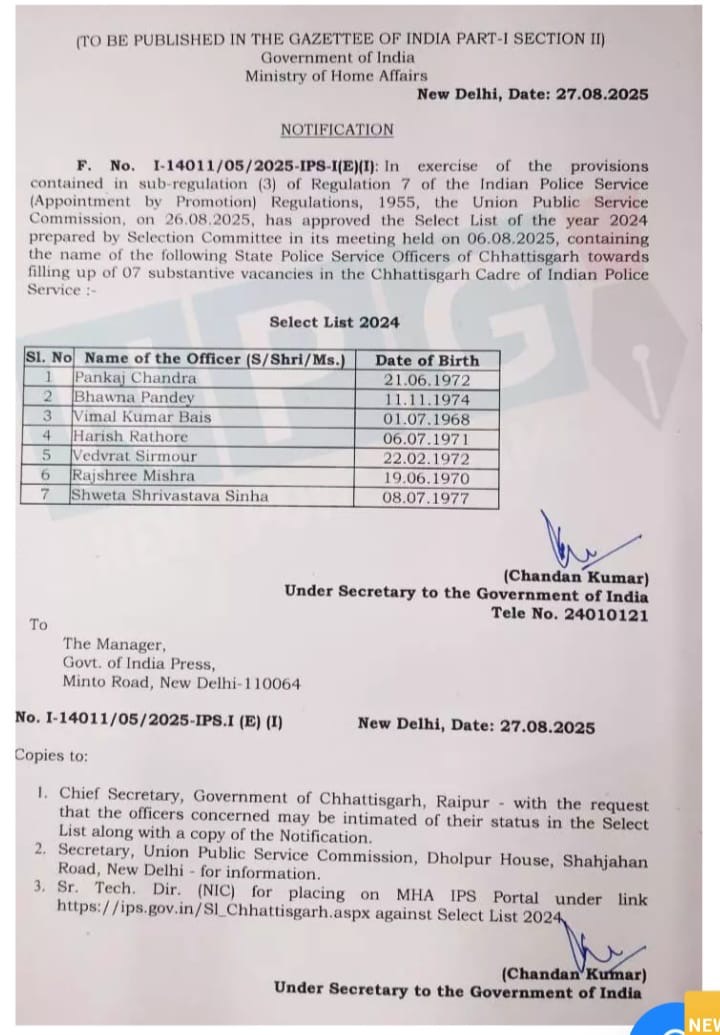 भारतीय पुलिस सेवा (पदोन्नति द्वारा नियुक्ति) विनियम, 1955 के विनियमन 7 के उप-विनियमन (3) में निहित प्रावधानों का प्रयोग करते हुए, संघ लोक सेवा आयोग ने दिनांक 26.08.2025 को, चयन समिति की 06.08.2025 को आयोजित बैठक में तैयार की गई वर्ष 2024 की चयन सूची को अनुमोदित किया है, जिसमें छत्तीसगढ़ राज्य पुलिस सेवा के निम्नलिखित अधिकारियों के नाम सम्मिलित हैं, जो भारतीय पुलिस सेवा के छत्तीसगढ़ कैडर में 07 स्थायी रिक्तियों को भरने हेतु हैं, जिनकी सूची निम्नानुसार है:-