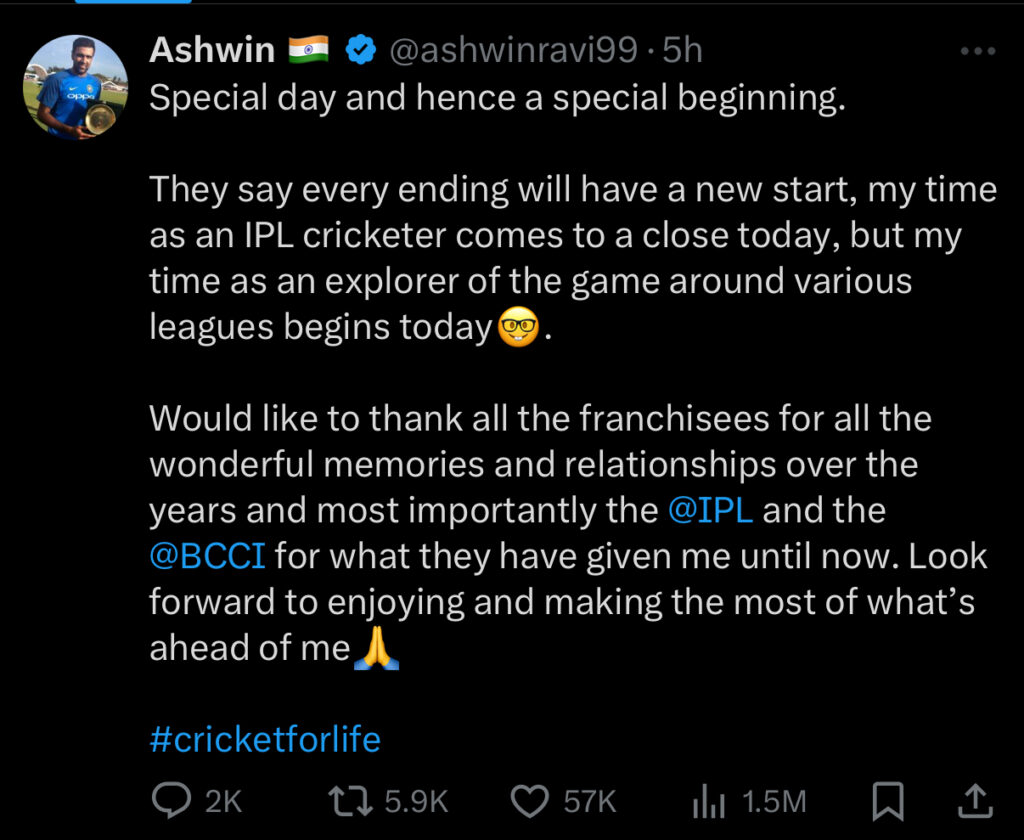 सोशल मीडिया पर एक पोस्ट को साझा करते हुए अश्विन ने संन्यास का ऐलान किया हैं। उन्होंने लिखा कि आज मेरे लिए खास दिन है और इसलिए एक नई शुरुआत भी, कहते हैं हर अंत एक नई शुरुआत लाता है, मेरा IPL करियर अब खत्म हो रहा है, लेकिन अब मैं दुनिया की अलग-अलग लीग्स में क्रिकेट का नया सफर शुरू कर रहा हूं। अश्विन ने कहा कि मैं सभी फ्रेंचाइजियों का शुक्रगुजार हूं, जिन्होंने मुझे यादगार मोमेंट और रिलेशन दिए। सबसे ज़्यादा धन्यवाद IPL और BCCI को, जिन्होंने अब तक मुझे इतना कुछ दिया। आगे आने वाले वक्त को इंजॉय करने का इंतजार है।