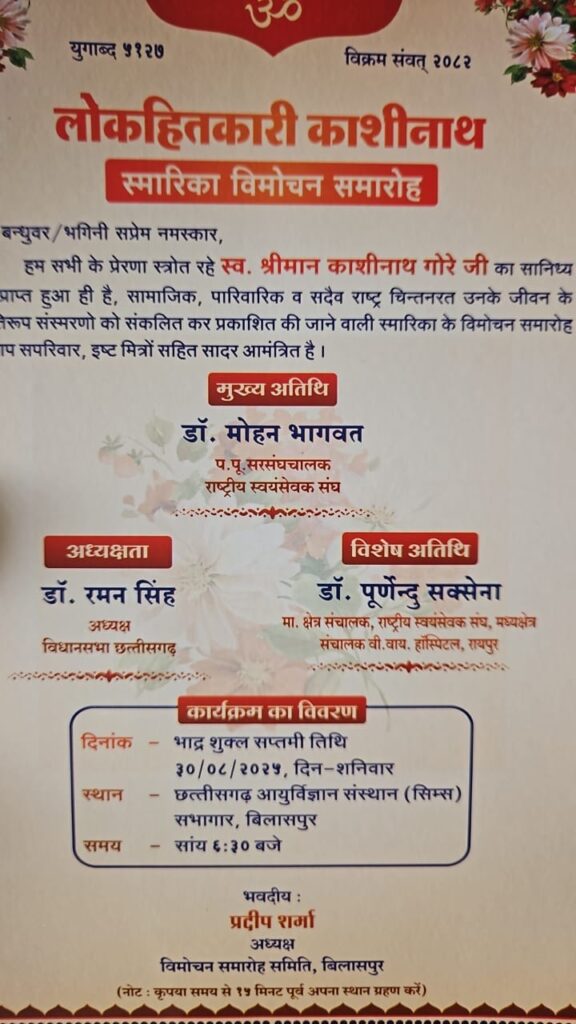 बिलासपुर। समाज और राष्ट्र के लिए अपना संपूर्ण जीवन समर्पित करने वाले स्वर्गीय काशीनाथ गोरे जी की स्मृतियों पर आधारित लोकहितकारी काशीनाथ स्मारिका का विमोचन 30 अगस्त शनिवार को बिलासपुर में आयोजित समारोह में होगा। यह आयोजन शाम 6:30 बजे छत्तीसगढ़ आयुर्विज्ञान संस्थान (सिम्स) के सभागार में होगा। इस अवसर पर राष्ट्रीय स्वयंसेवक संघ के सरसंघचालक डॉ. मोहन भागवत मुख्य अतिथि के रूप में उपस्थित रहेंगे। कार्यक्रम की अध्यक्षता छत्तीसगढ़ विधानसभा अध्यक्ष डॉ. रमन सिंह करेंगे।
