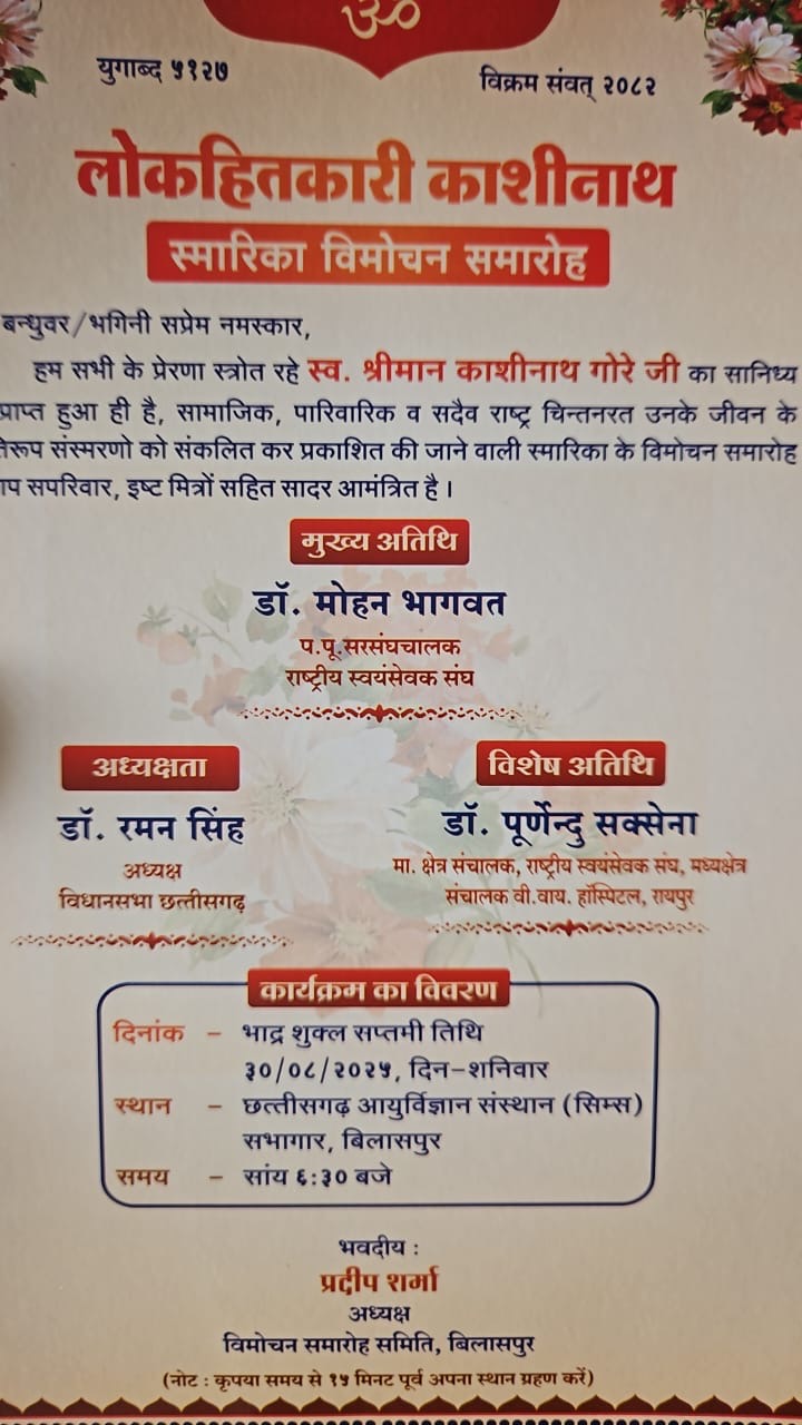 आरएसएस के सरसंघचालक डॉ. मोहन भागवत का बिलासपुर में 30 अगस्त को प्रवास: स्व. काशीनाथ गोरे स्मृति स्मारिका विमोचन कार्यक्रम के होंगे मुख्य अतिथि