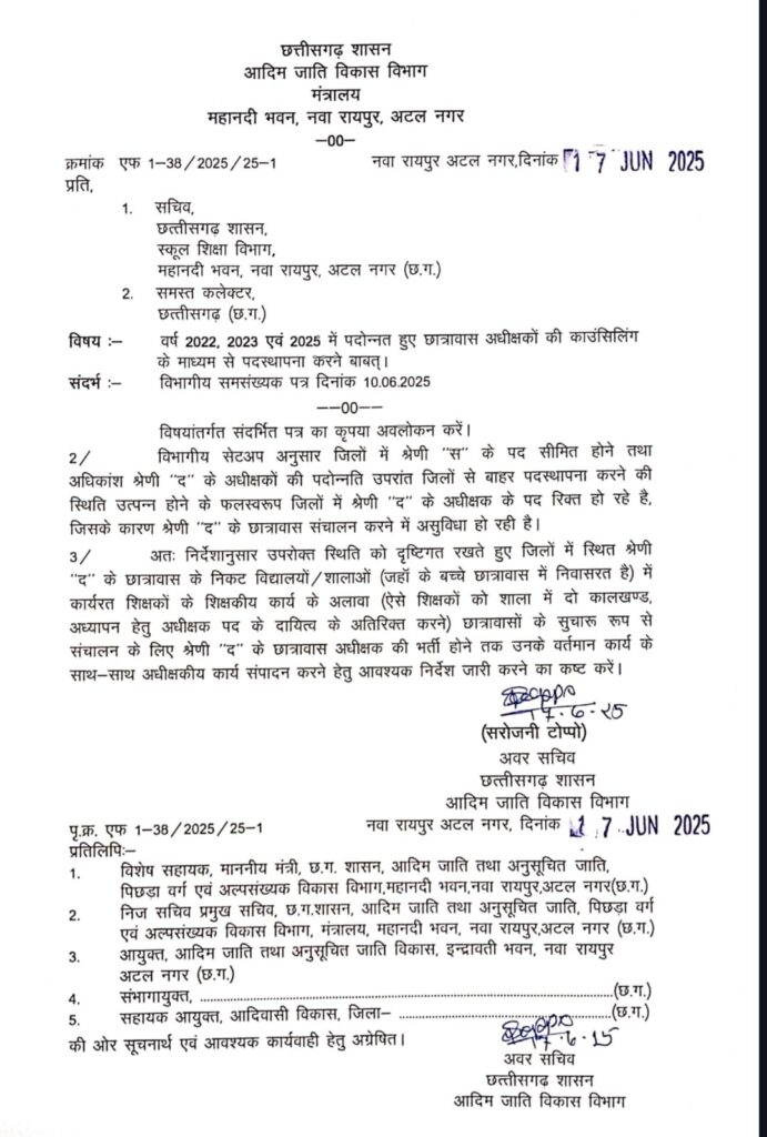 छत्तीसगढ़ शासन के आदिम जाति विकास विभाग महानदी भवन नया रायपुर से 17 जून को एक आदेश जारी किया गया था। जारी आदेश के अनुसार अधिकांश श्रेणी द के अधीक्षकों की पदोन्नति करने के उपरांत जिलों से बाहर पदस्थापना करने की स्थिति में अधिकांश पद रिक्त हो रहे है। उक्त स्थिति को देखते हुए निर्देश जारी किया गया है कि छात्रावासों के निकट स्कूलों में जहां छात्रावास के बच्चे पढ़ते हैं वहां के शिक्षकों को छात्रावास अधीक्षक का अतिरिक्त दायित्व सौंपा जाए।
