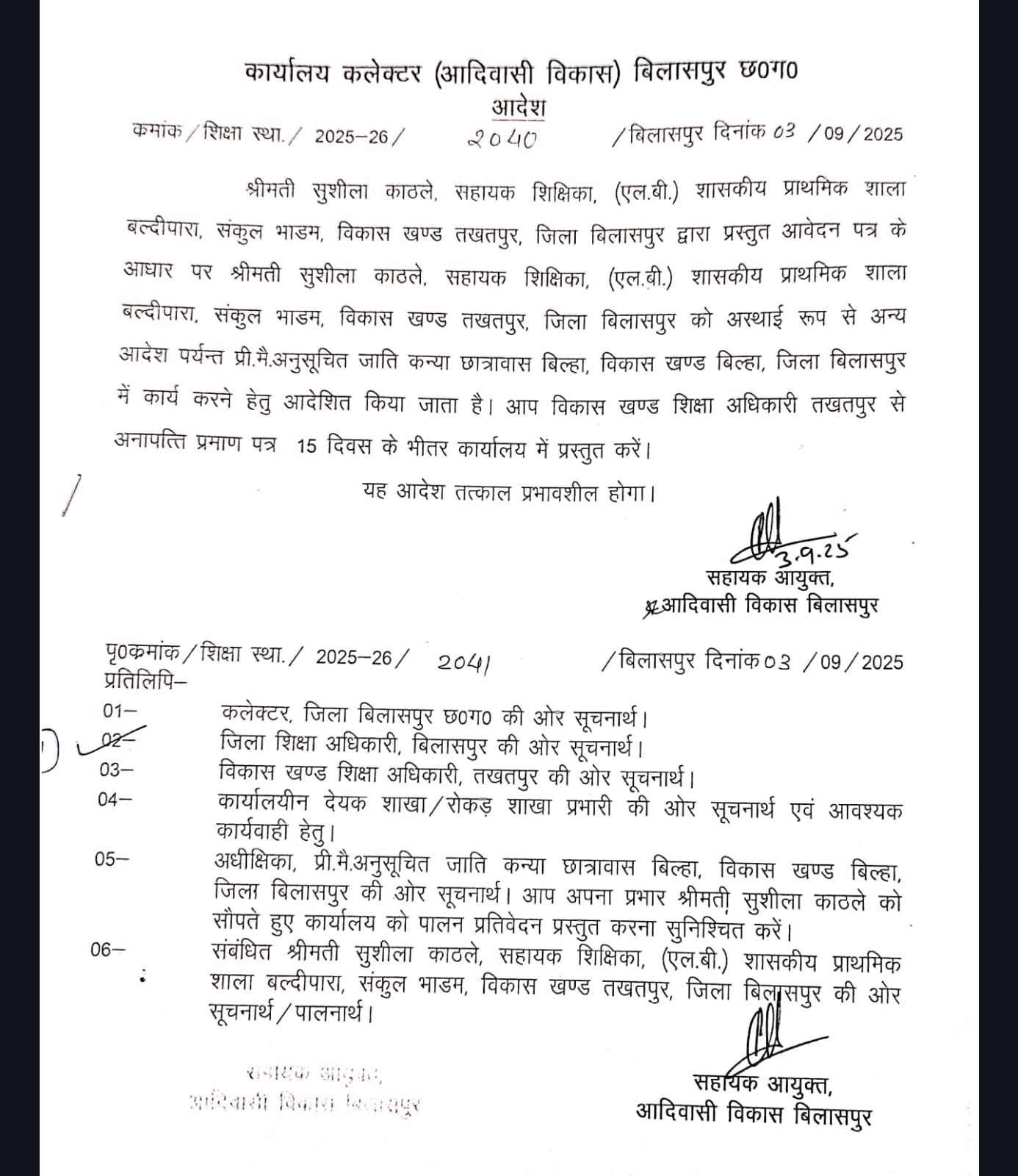 सुशीला काठले सहायक शिक्षिका एलबी शासकीय प्राथमिक शाला ब्लदीपारा संकुल भाड़म ब्लॉक तखतपुर ने सहायक आयुक्त आदिवासी विकास विभाग बिलासपुर के समक्ष हॉस्टल अधीक्षक के पद पर डेपुटेशन पर जाने हेतु आवेदन प्रस्तुत किया था। आवेदन के आधार पर सहायक आयुक्त आदिवासी विकास विभाग बिलासपुर ने एक सिंगल आदेश निकाल सुशीला काठले सहायक शिक्षिका एलबी शासकीय प्राथमिक शाला ब्लदीपारा संकुल भाड़म ब्लॉक तखतपुर को बिल्हा ब्लॉक के अनुसूचित जाति प्री मैट्रिक कन्या छात्रावास बिल्हा में छात्रावास अधीक्षिका के पद पर पदस्थ कर दिया।