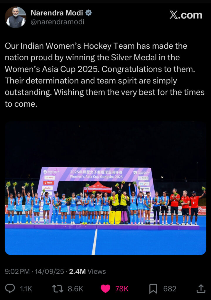 “हमारी भारतीय महिला हॉकी टीम ने महिला एशिया कप 2025 में रजत पदक जीतकर देश को गौरवान्वित किया है। उन्हें बहुत बधाई। उनका मजबूत संकल्प और टीम भावना अद्भुत है। आने वाले समय के लिए उन्हें शुभकामनाएं।“