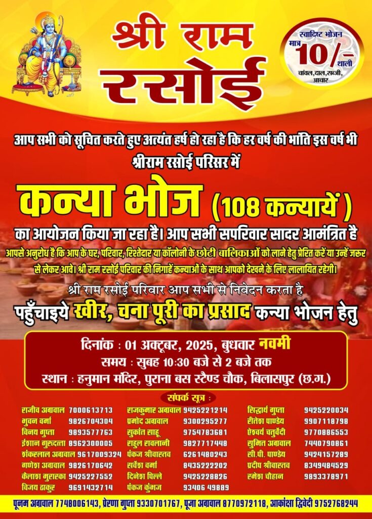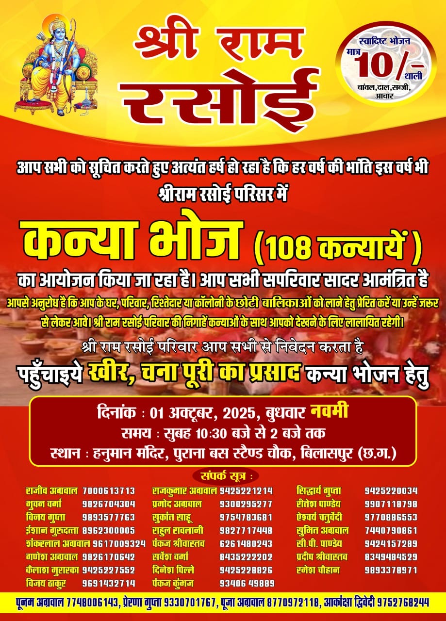 बिलासपुर। गत वर्षों की भाती इस वर्ष भी दुर्गा नवमी के पावन दिवस पर श्री राम रसोई सेवा समिति के सदस्यों द्वारा 108 कन्यायें का भोज कार्यक्रम आयोजित किया गया है। कार्यक्रम 01 अक्टूबर, 2025, बुधवार नवमी समय : सुबह 10:30 बजे से 2 बजे तक स्थान : हनुमान मंदिर, पुराना बस स्टैण्ड चौक, बिलासपुर में आयोजित किया गया है। बीएनआई ,अग्रवाल समाज, ब्राह्मण समाज हरिहर ऑक्सीजोन परिवार एवं विभिन्न समाज संगठन के पदाधिकारी व महिलाएं अपनी सेवा यहां प्रदान करेंगे।