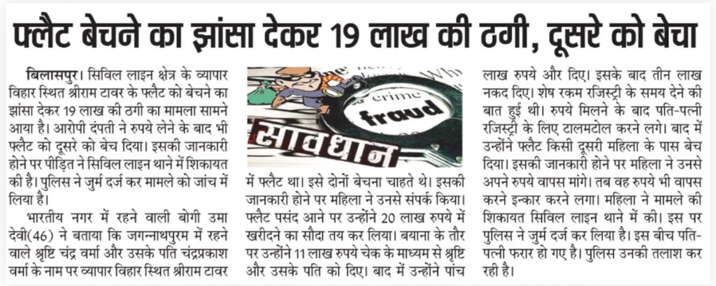 भारतीय नगर में रहने वाली बोगी उमा देवी (46) ने बताया कि जगन्नाथपुरम राजकिशोर नगर में रहने वाले श्रृष्टि चंद्र वर्मा और उसके पति चंद्रप्रकाश वर्मा उर्फ बिलासपुर के कुख्यात बंटी और बबली के नाम पर व्यापार विहार स्थित श्रीराम टावर में फ्लैट था। इसे दोनों बेचना चाहते थे, इसकी जानकारी होने पर महिला ने उनसे संपर्क किया। फ्लैट पसंद आने पर उन्होंने 20 लाख रुपये में खरीदने का सौदा तय कर लिया। बयाना के तौर पर उन्होंने 11 लाख रुपये चेक के माध्यम से श्रृष्टि और उसके चंद्रप्रकाश पति को दिए। बाद में उन्होंने पांच लाख रुपये और दिए। इसके बाद तीन लाख नकद दिए। शेष रकम रजिस्ट्री के समय देने की बात हुई थी। रुपये मिलने के बाद पति-पत्नी रजिस्ट्री के लिए टालमटोल करने लगे। बाद में उन्होंने फ्लैट किसी दूसरी महिला के पास बेच दिया। इसकी जानकारी होने पर महिला ने उनसे अपने रुपये वापस मांगे। तब वह रुपये भी वापस करने इन्कार करने लगा। महिला ने मामले की शिकायत सिविल लाइन थाने में की। इस पर पुलिस ने जुर्म दर्ज कर लिया है। इस बीच बंटी और बबली उर्फ चंद्र प्रकाश सृष्टि पति-पत्नी फरार हो गए है। पुलिस उनकी तलाश कर रही है।