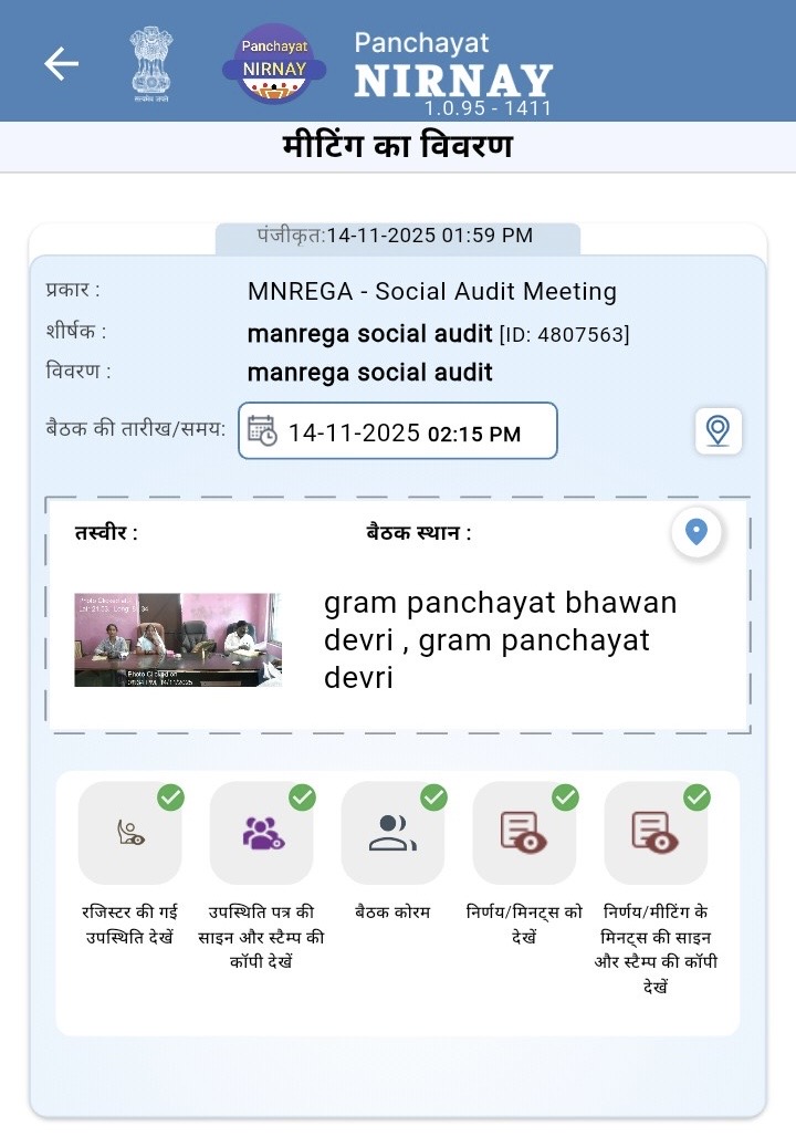 ऽ ग्राम सभा की कार्यवाही का डिजिटल साक्ष्यः- अक्सर यह शिकायतें आती थीं कि सोशल ऑडिट के दौरान ग्राम सभाएं केवल कागजों पर होती थीं। इस ऐप के माध्यम से ग्राम सभा की बैठक की जियो-टैग्ड, तस्वीरें और वीडियो अपलोड करना अनिवार्य होगा, जिससे वास्तविक बैठक की पुष्टि होगी।