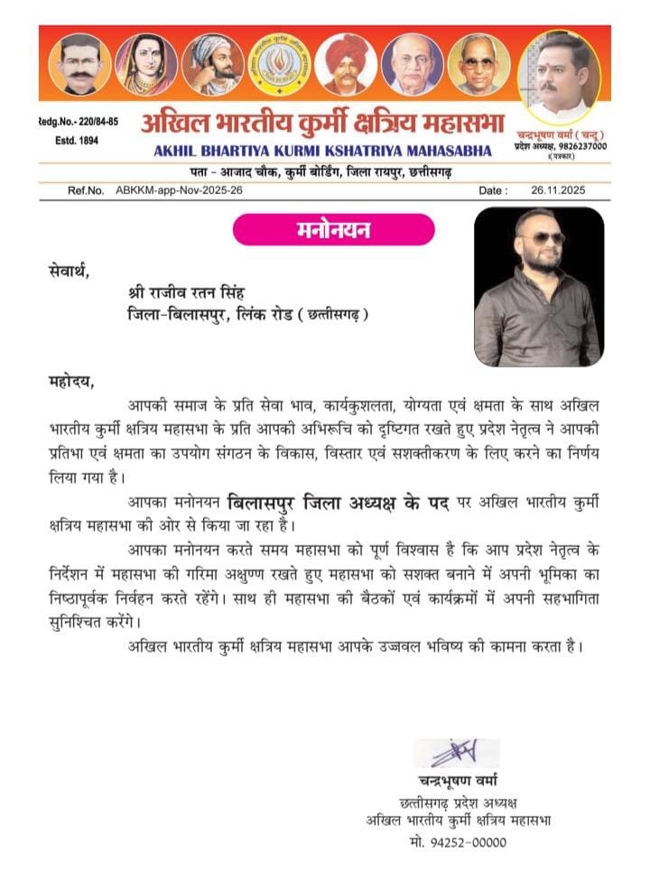 अखिल भारतीय कुर्मी क्षत्रिय महासभा द्वारा बिलासपुर जिला अध्यक्ष राजीव रतन सिंह को किया गया नियुक्त