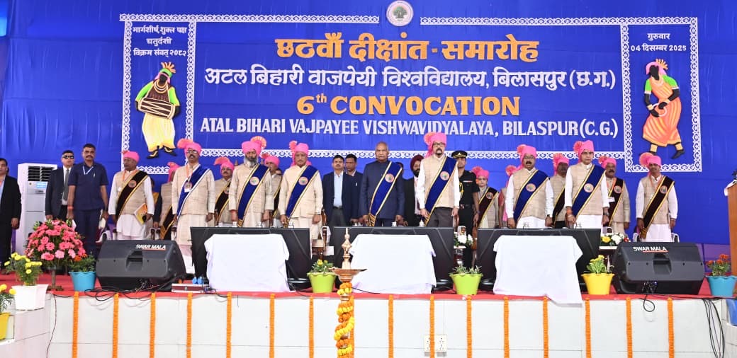 बिलासपुर, 4 दिसम्बर 2025/अटल बिहारी वाजपेयी विश्वविद्यालय के छठवें दीक्षांत समारोह का आयोजन आज पूर्व राष्ट्रपति श्री रामनाथ कोविंद के मुख्य आतिथ्य में गरिमामय वातावरण में किया गया। कार्यक्रम की अध्यक्षता राज्यपाल श्री रमेन डेका ने की। अति विशिष्ट अतिथि के तौर पर मुख्यमंत्री श्री विष्णु देव साय, विशिष्ट अतिथि उपमुख्यमंत्री श्री अरुण साव तथा उच्च शिक्षा मंत्री श्री टंकराम वर्मा शामिल हुए। कार्यक्रम में विश्वविद्यालय के कुलपति आचार्य डॉ. दिवाकर नाथ वाजपेयी उपस्थित रहे। समारोह में 64 शोद्यार्थियों को शोध उपाधि, 92 गोल्ड मेडल एवं 36950 स्नातक एवं स्नातकोत्तर उपाधि दी गई।