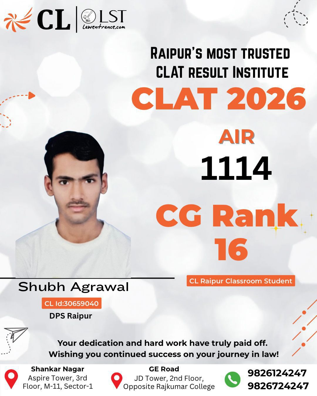 कोटा\कोटा नगर के लिए यह गौरव का क्षण है! गायत्री ट्रेडर्स के राजेश अग्रवाल जी के सुपुत्र, शुभ अग्रवाल ने CLAT 2025 की परीक्षा में ऑल इंडिया रैंक 1114 और C.G रैंक 16 प्राप्त कर कोटा का नाम रोशन किया है। उनकी यह उपलब्धि निःसंदेह पूरे नगर के लिए प्रेरणास्रोत है।