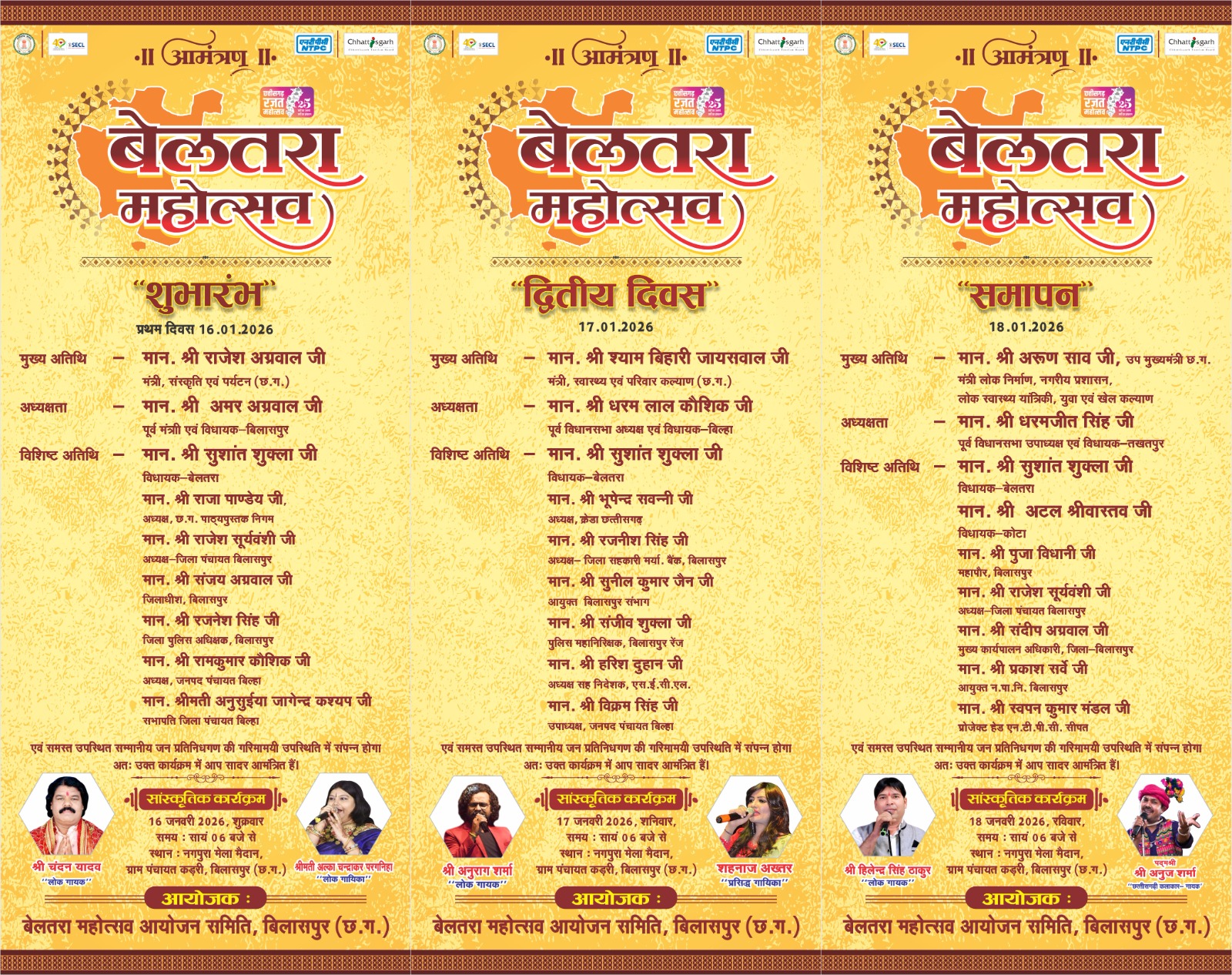 महोत्सव का भव्य शुभारंभ 16 जनवरी संस्कृति एवं पर्यटन मंत्री राजेश अग्रवाल के मुख्य आतिथ्य में होगा। कार्यक्रम की अध्यक्षता बिलासपुर विधायक अमर अग्रवाल करेंगे। विशिष्ट अतिथि के तौर पर बेलतरा सुशांत शुक्ला, छत्तीसगढ़ पाठ्य पुस्तक निगम के अध्यक्ष राजा पाण्डेय, जिला पंचायत अध्यक्ष राजेश सूर्यवंशी सहित अन्य जनप्रतिनिधि एवं प्रशासनिक अधिकारी उपस्थित रहेंगे। सांस्कृतिक कार्यक्रमों की प्रस्तुति देने लोक गायक चंदन यादव एवं लोक यायिका श्रीमती अल्का चन्द्राकर शामिल होंगी। महोत्सव के दूसरे दिन 17 जनवरी 2026 को सांस्कृतिक कार्यक्रमों की निरंतरता बनी रहेगी। कार्यक्रम में स्वास्थ्य मंत्री श्याम बिहारी जायसवाल बतौर मुख्य अतिथि के रूप में शामिल होंगे। अध्यक्षता बिल्हा विधायक धरम लाल कौशिक करेंगे। विशिष्ट अतिथि के रूप बेलतरा सुशांत शुक्ला, क्रेडा अध्यक्ष भूपेन्द्र सवन्नी, जिला सहकारी मर्यादित बैंक के अध्यक्ष सहित विभिन्न जनप्रतिनिधि उपस्थित रहेंगे। शाम 6 बजे से इस दिन मंच पर लोक गायक अनुराग शर्मा एवं प्रसिद्ध गायिका शहनाज अख्तर अपनी प्रस्तुतियां देंगे।