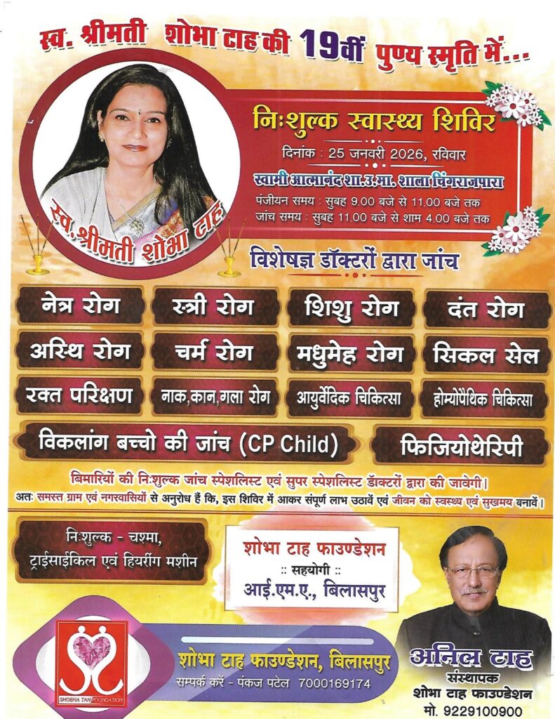 बिलासपुर । शोभा टाह के 19वीं पुण्यतिथि पर विशाल निशुल्क स्वास्थ्य शिविर का आयोजन किया जा रहा है । 25 जनवरी को आयोजित इस विशाल स्वास्थ्य शिविर में में लगभग 15 अलग-अलग फैकल्टी के विशेषज्ञ डॉक्टर अपनी सेवाएं देंगे। इस विशाल आयोजन की तैयारी व्यापक स्तर में अंतिम चरण में है। विदित होगी लगातार गत 18 साल से निरंतर स्वास्थ्य के प्रति जागरूक के साथ जरूरतमंद एवं अंतिम पंक्ति के लोगों के बेहतर स्वास्थ्य के प्रति प्रतिबद्ध अनिल टाह यह अभियान को निरंतर जारी रखे हुए हैं ।