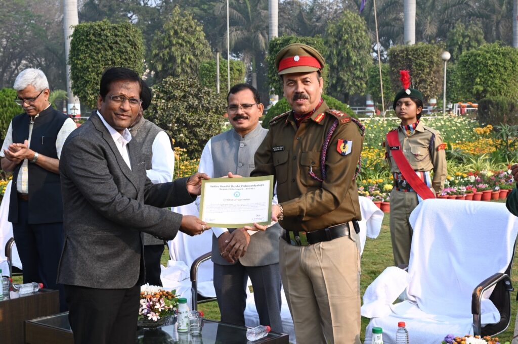 गणतंत्र दिवस के अवसर पर डॉ. गिरीश चंदेल, कुलपति, इंदिरा गांधी कृषि विश्वविद्यालय, रायपुर द्वारा “विकसित भारत यंग लीडर डायलॉग” प्रतियोगिता में चयनित होकर राष्ट्रीय युवा उत्सव 2026 में विश्वविद्यालय का प्रतिनिधित्व करने पर बैरिस्टर ठाकुर छेदीलाल कृषि महाविद्यालय के एम.एससी. (कृषि) प्रथम वर्ष की छात्रा कु. मानसी चंद्राकर एवं बी.एससी. (कृषि) चतुर्थ वर्ष के छात्र बेदराम वर्मा को प्रशस्ति पत्र प्रदान कर सम्मानित किया गया। साथ ही डॉ. एस.के. वर्मा, मुख्य वैज्ञानिक, क्षेत्रीय कृषि अनुसंधान केंद्र, बिलासपुर, संतोष चंद्राकर, कंप्यूटर ऑपरेटर तथा श्रीमती सुकवारा यादव, चतुर्थ श्रेणी कर्मचारी को उत्कृष्ट कार्य के लिए प्रशस्ति पत्र देकर सम्मानित किया गया।