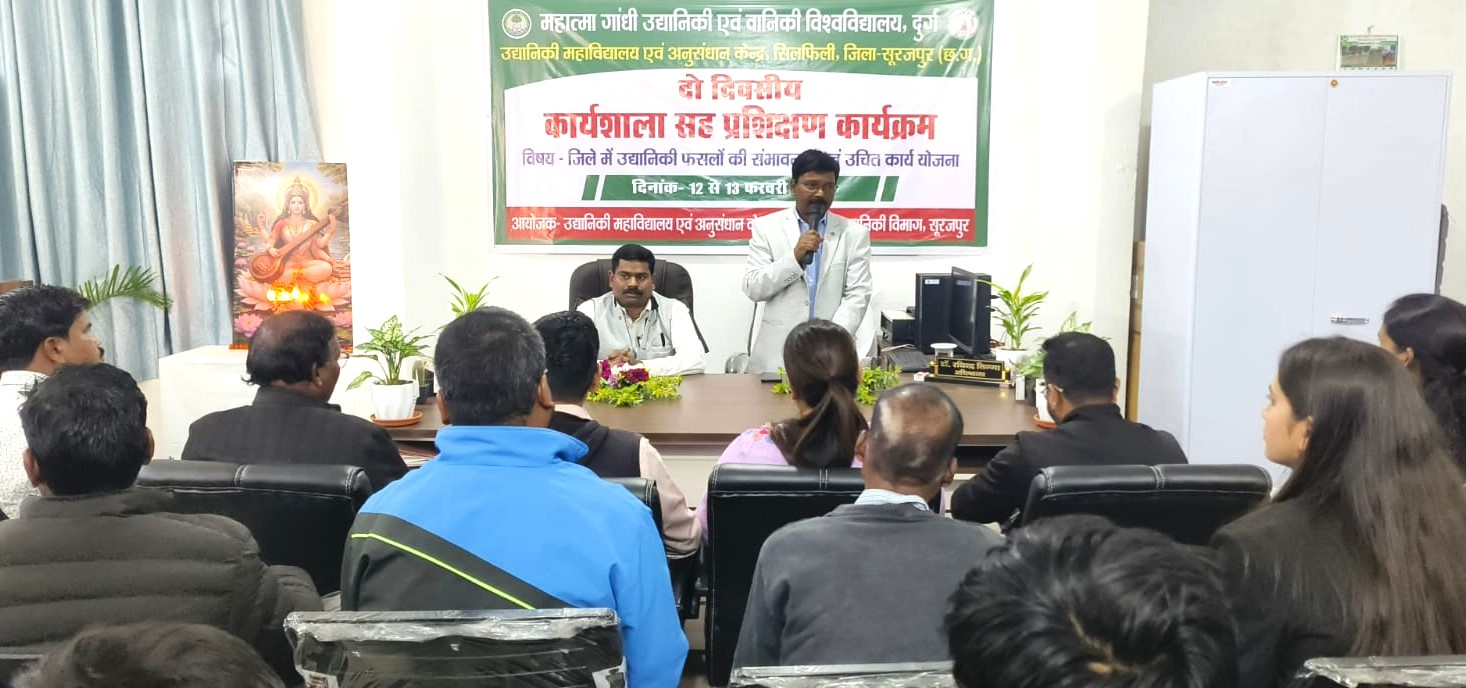 सिलफिली/महात्मा गांधी उद्यानिकी एवं वानिकी विश्वविद्यालय, दुर्ग के अंतर्गत संचालित उद्यानिकी महाविद्यालय एवं अनुसंधान केंद्र सिलफिली सूरजपुर में दो दिवसीय कार्यशाला सह प्रशिक्षण कार्यक्रम संपन्न हुआ.जिसमें महाविद्यालय के अधिष्ठाता डॉ रविन्द्र तिग्गा, सूरजपुर उद्यान विभाग के सहायक संचालक उद्यान जे. मरावी, जिले के समस्त वरिष्ठ उद्यानिकी विकास अधिकारी, उद्यानिकी विकास अधिकारी, ग्रामीण उद्यानिकी विस्तार अधिकारी के साथ साथ अतिथि शिक्षक एवं छात्र छात्राएं उपस्थित हुए.