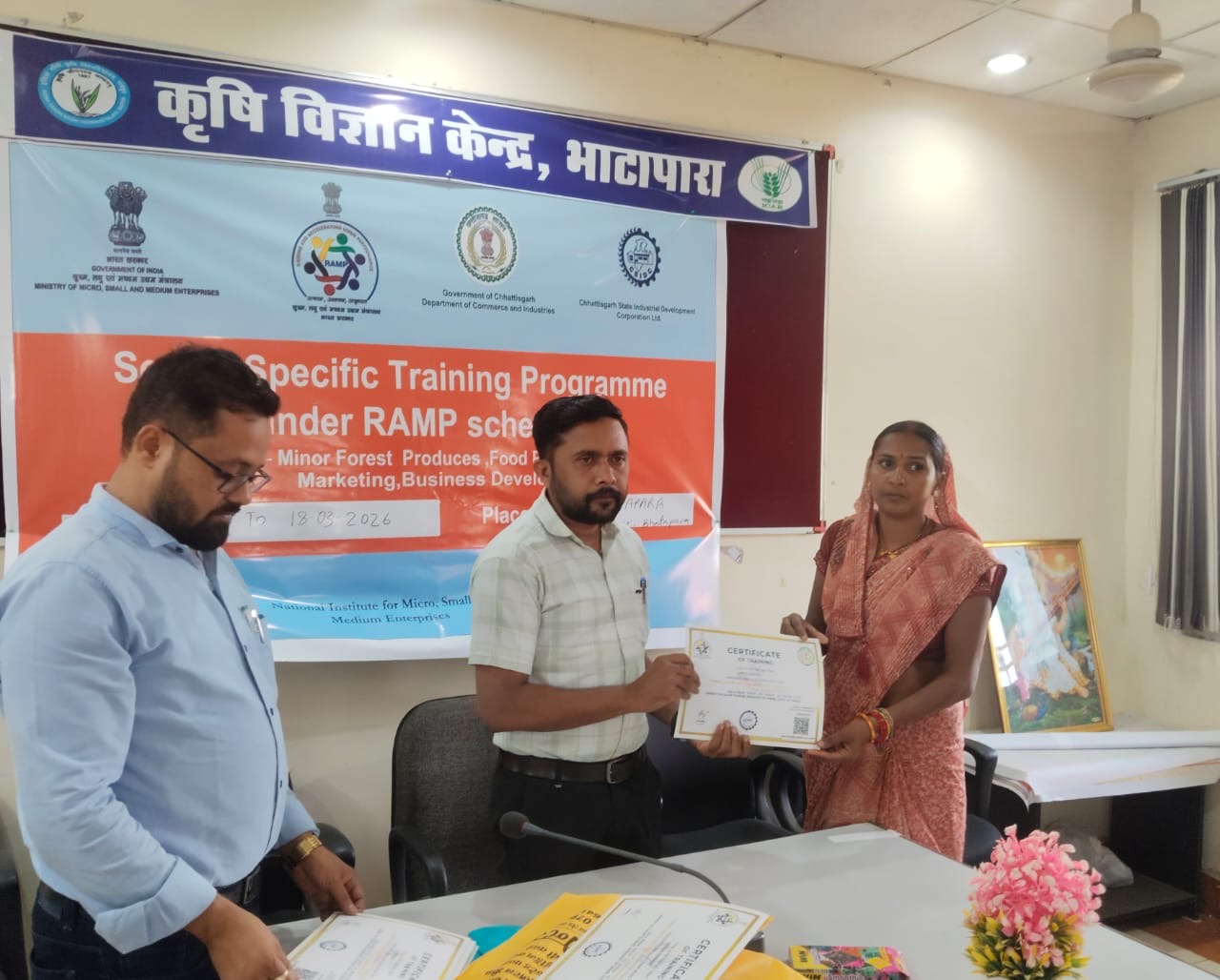 इस 3दिवसीय प्रशिक्षण वर्ग में 5वां चरण रहा। खाद्य-पदार्थों उत्पादन, संरक्षण, उपयोग, निर्माण, मूल्य संवर्धन एवं स्वच्छता,लघु वनोपज, उन्नत, संरक्षण, तकनीकी शिक्षा जैसे विषयों पर प्रशिक्षण दिया गया।तथा कार्यक्रम के तीसरा दिवस, उद्यमी पंजियन, व प्रशिक्षणार्थियों को प्रमाण पत्र वितरण किया गया।इस कार्यक्रम के प्रशिक्षक कृतेश हिरवानी, कृषि विज्ञान केन्द्र भाटापारा के प्रमुख, वैज्ञानिक डॉ अंगत सिंह राजपूत, डॉ सविता राजपूत, डॉ प्रदीप कश्यप, योगेश जायसवाल, नवबृज शकांभरी कृषि उत्पादक मार्य, सहकारी समिति पलारी, देवसुन्दा सी,ई, ओ,नागेश वर्मा,बी,ओ,डी,डाकेश्वर डग्गू वर्मा सहित उपस्थित थे।