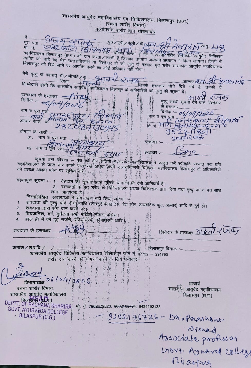बिलासपुर। अजय रजक मंदिर चौक जरहाभाटा, बिलासपुर द्वारा शासकीय आयुर्वेद महाविद्यालय एवं चिकित्सालय बिलासपुर को देहदान करने हेतु वसीयत/सहमति पत्र दी गयी। अजय रजक को देहदान हेतू श्रीमती ममता गुप्ता, अध्यक्ष स्वाभिमान समाज कल्याण समिति एवं भुवन वर्मा, संयोजक हरिहर आक्सीजोन द्वारा प्रेषित किया गया। महाविद्यालय रचना शारीर विभाग की ओर से डा. प्रशांत निषाद एवं कविता प्रधान द्वारा काऊसिंलिग एवं अन्य प्रक्रिया पूर्ण की गयी। अजय रजक के देहदान जैसे महत्वपूर्ण एवं सामाजिक कार्य के सम्मान हेतू हरिहर आक्सीजोन वृक्षारोपण अभियान समिति के द्वारा कोन्हेर उद्यान बिलासपुर में सम्मान कार्यक्रम आयोजित किया गया और महाविद्यालय के रचना शारीर विभागाध्यक्ष डा. प्रशांत निषाद द्वारा देहदान की प्रक्रिया उसके महत्व तथा चिकित्सा छात्रों द्वारा देह पर किये जाने वाले अध्ययन के विषय में जानकारी दी गयी।