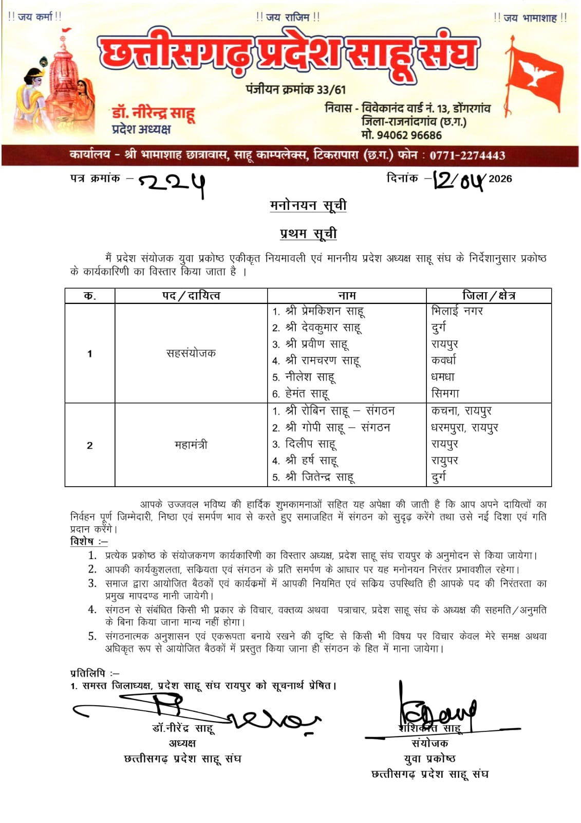 हेमन्त साहू बने साहू संघ युवा प्रकोष्ठ के प्रदेश सह संयोजक